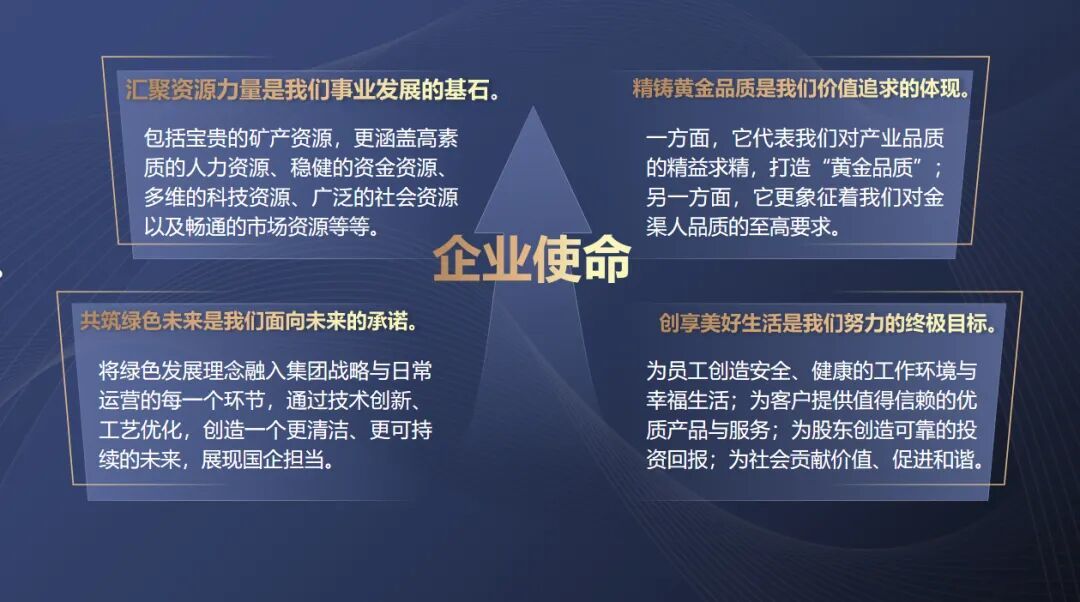 金渠集團(tuán)的企業(yè)使命是“匯聚資源力量,精鑄黃金品質(zhì),共筑綠色未來(lái),創(chuàng)享美好生活”。這一使命定義了“金渠為何而存在”,明確了我們的終極目標(biāo)和核心追求。