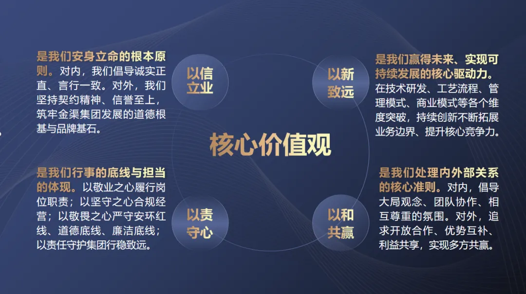 金渠集團(tuán)的企業(yè)核心價(jià)值觀是“以信立業(yè)、以新致遠(yuǎn)、以責(zé)守心、以和共贏”。這一價(jià)值觀規(guī)范了“金渠應(yīng)如何去做”,確立了全體金渠人共同信奉并遵循的根本價(jià)值準(zhǔn)則。