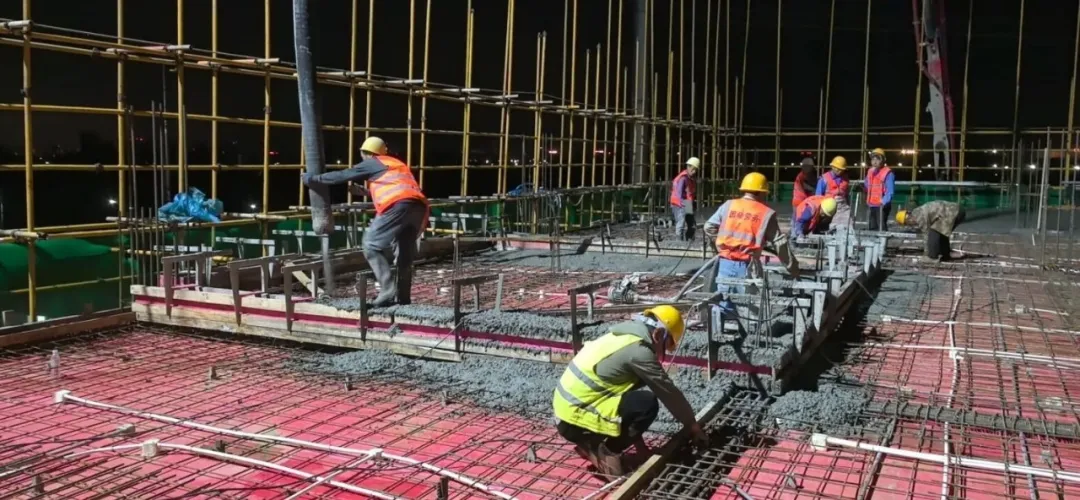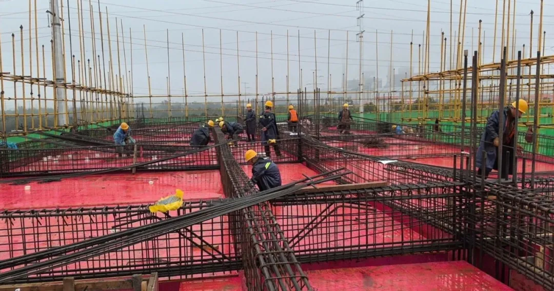 面對持續(xù)降雨給高空作業(yè)帶來的嚴峻考驗,項目部迅速響應(yīng),公司啟動雨季施工應(yīng)急預(yù)案,采取“靈活機動、輪班攻堅”的策略。雨水稍歇即是命令,施工人員立即投入戰(zhàn)斗,身披雨衣、腳踏濕滑架管,進行精準測量和模板加固;大雨襲來時,則轉(zhuǎn)為材料準備和技術(shù)交底,做到“人停機不停”。在高空作業(yè)風(fēng)險大、支模精度要求高的雙重壓力下,團隊實行24小時“兩班倒”,在泥濘潮濕的環(huán)境中連續(xù)奮戰(zhàn)。技術(shù)人員與監(jiān)理人員全過程旁站監(jiān)督,對模板平整度、垂直度及支撐體系穩(wěn)定性實施毫米級的精確核驗;項目管理人員躬耕一線,及時解決現(xiàn)場出現(xiàn)的各個問題,確保每一道工序均符合高標準要求,最大限度降低陰雨天氣對進度的影響,為后續(xù)混凝土澆筑爭取了寶貴時間。
